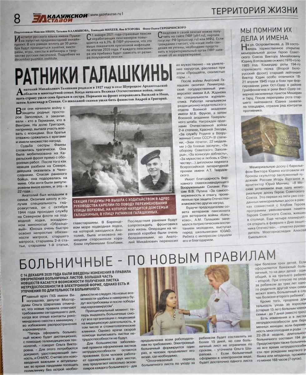 Руководство и Совет ветеранов Пансионата «Коньково» для ветеранов войны выражает огромную благодарность коллективу редакции газеты «Москва За калужской заставой» в лице главного редактора Дарьи Буравчиковой за публикации очерков о ветеранах нашего Пансионата. Так же слова благодарности выразили весь коллектив ветеранов Пансионата за публикацию очерка об участнике ВОВ Галашкине Анатолие Михайловиче и за внимание к боевым ветеранам Великой Отечественной войны, принимавшим участие в решающих сражениях в тяжёлые годы суровой войны 1941 – 1945 гг. Мы рассчитываем на активное дальнейшее сотрудничество и искренне желаем всему коллективу редакции крепкого здоровья, счастья, благополучия, успехов и карьерного роста в их важной и творческой работе, и долгих лет жизни!