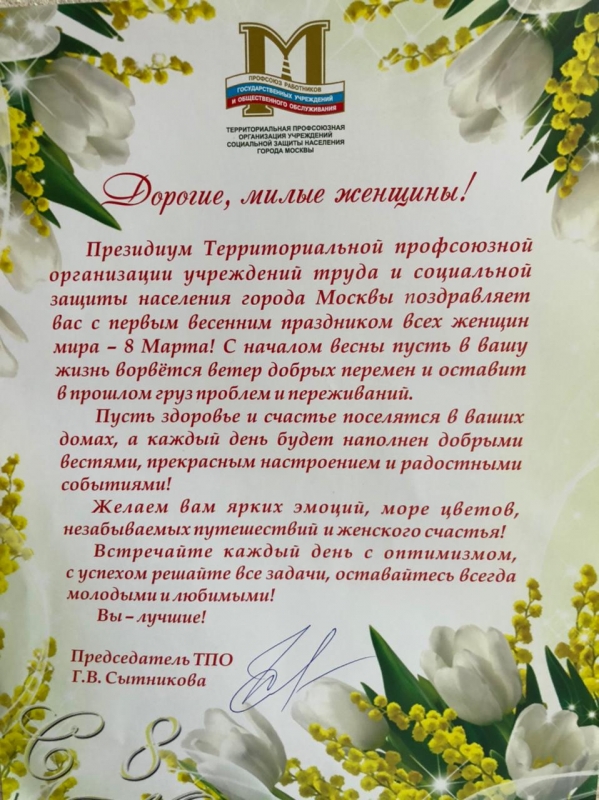 Председатель Президиума территориальной профсоюзной организации учреждений труда и социальной защиты населения города Москвы Галина Валентиновна Сытникова обратилась с поздравлениями и наилучшими пожеланиями с Международным женским Днём - 8 Марта к нашим женщинам.